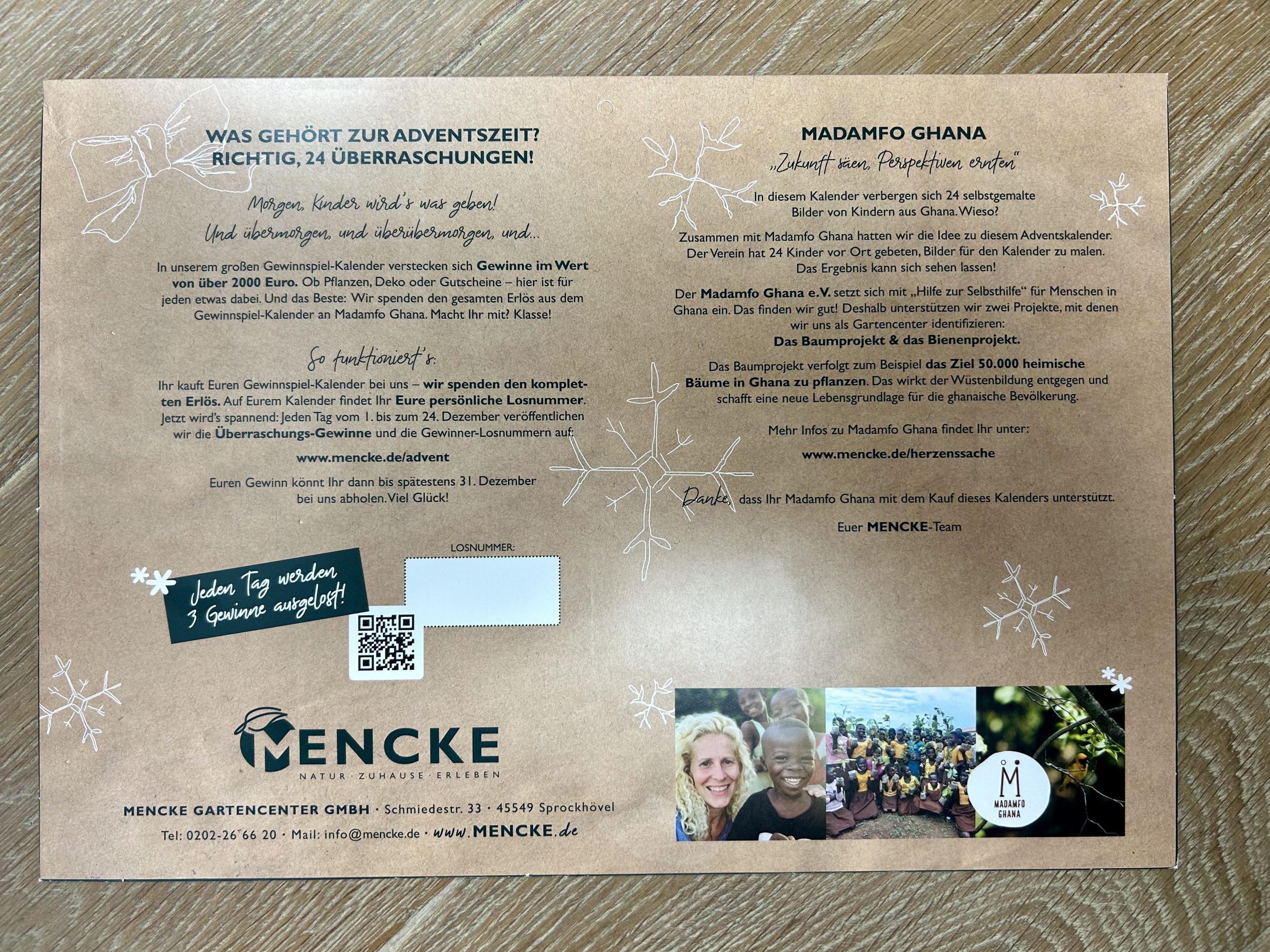 Das Gartencenter Mencke hat einen Madamfo Ghana Adventskalender gestaltet. Hinter jedem Türchen erwartet euch ein selbstgemaltes Bild von einem Kind aus Ghana – und die Chance auf einen von 24 Gewinnen im Gesamtwert von 2.000 EUR!